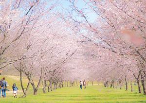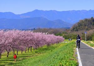 約1.2kmにわたって続くピンク色のトンネルは、まさに絶景。ソメイヨシノとはまた違った濃いめの花色が、青空にとてもよく映えます。
